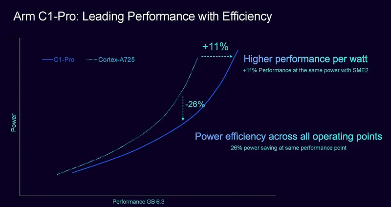 C1-Pro是A725的升级,峰值功耗差异不大的情况下,性能提升了11,相同性能下功耗则降低了26。