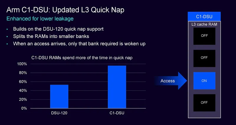 DSU是连接多个处理器核心的关键模块,这一代的新DSU命名为C1-DSU。这一代的C1-DSU,Arm宣称功耗可以节省11,Quick Nap内存(L3支持的功能)功耗可以降低7。