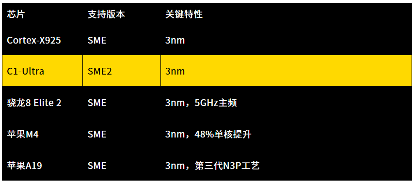 SME(Scalable Matrix Extension,可扩展矩阵扩展)是Armv9架构引入的指令集,虽然SME指令集在2021年就提出了,但是Arm的Cortex-X系列处理器从X925才开始支持第一代的SME指令集,苹果公司的M4处理器和今年的A19处理器也支持第一代的SME指令集,最新的高通的8 Elite 2处理器也可以支持SME指令集。今年的Arm C1系列则全面升级到了SME2指令集。
