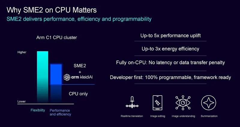 在性能表现上,Arm宣称SME2对性能上有显著帮助,例如在AI任务中,SME2可使CPU集群的AI性能提升5倍,同时实现了3倍的能效提升。由于AI类计算需要调用非常多的矩阵计算,因此SME2在AI类应用中尤为有效。