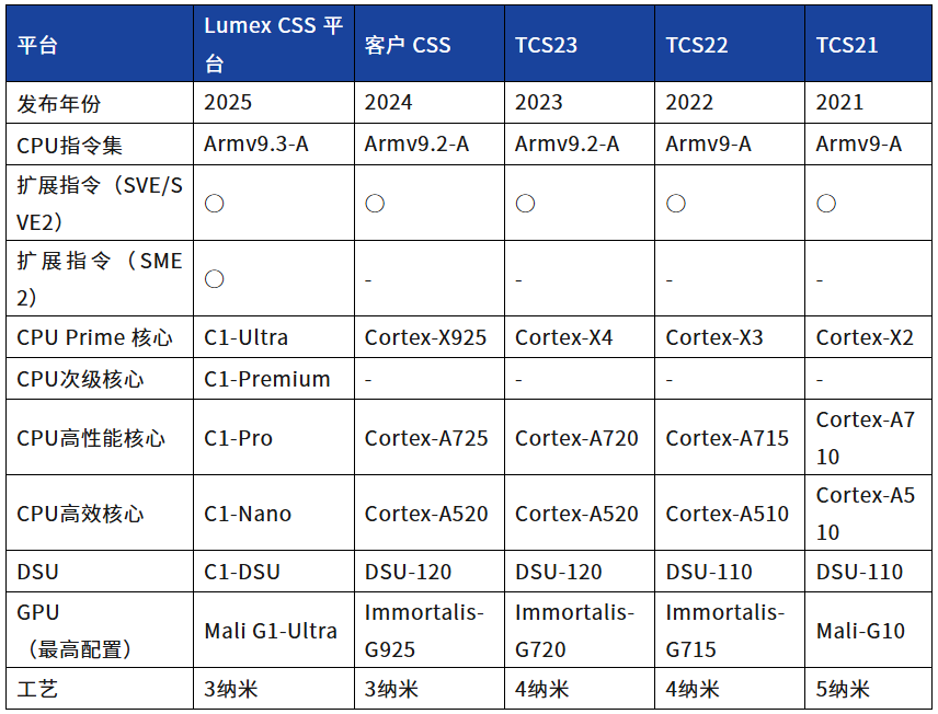 今年用于手机处理器的C1系列和G1系列则属于Lumex套件,全称叫做Arm Lumex CSS Platform。那么Lumex里面都包含什么?根据Arm的资料,Lunux包含CPU、GPU、System等IP设计,还包含了3nm等工艺节点的物理实现,以及一些生态的支持,例如Pre-silicon的平台指导、安卓16支持、SME2的应用等等,可以帮助芯片厂商更快的完成芯片设计。