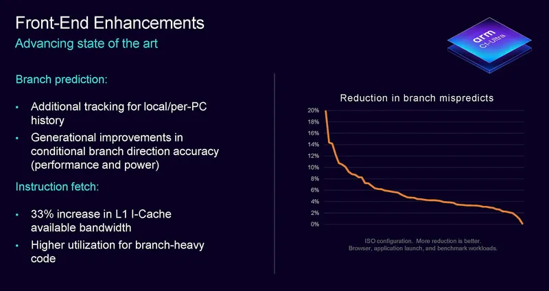 在前端设计上,C1-Ultra和上一代X925的核心参数decoder宽度,ALU数量,FPU数量等基本相同。C1-Ultra主要优化是提升分支预测性能,增加记录预测历史的空间,从而提升分支预测的准确性,对性能和功耗都有帮助。此外,一个明显的变化是,L1指令缓存的带宽提升了33,以实现更快的指令获取速度。