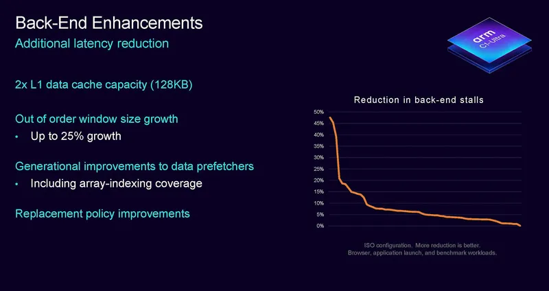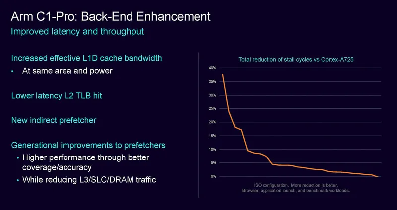 C1-Pro在后端上提升了数据L1缓存的带宽,优化L2的TLB延迟,新增了间接预期器,提升预取的性能和减少L3到SLC和内存的数据拥塞。