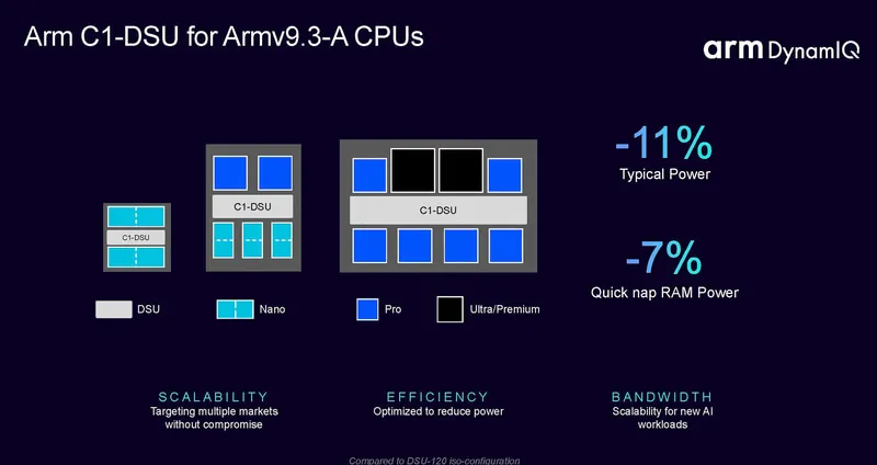 DSU是连接多个处理器核心的关键模块,这一代的新DSU命名为C1-DSU。这一代的C1-DSU,Arm宣称功耗可以节省11,Quick Nap内存(L3支持的功能)功耗可以降低7。