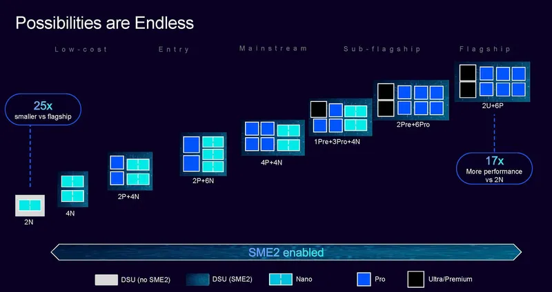和上一代一样,C1-DSU最多可以支持14个处理器核心的组合,并且可以实现不同C1处理器的组合,除了最初级的2核心配置,其余都可以支持SME2。