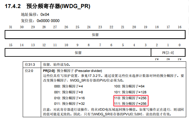 IWDG->PR 写入 0x06 是为了配置预分频器值为 256(分频系数为 2^8),将时钟周期放大到较低的频率。如图 19 所示。
